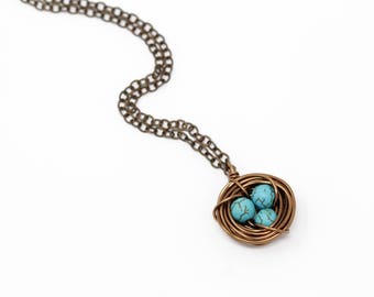 • Gift For Mom - Mothers Necklace - Turquoise Bird Nest Necklace - Family Jewelry - Gift For Mother - Woodland Necklace