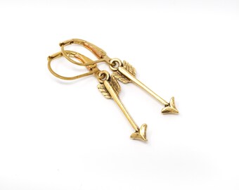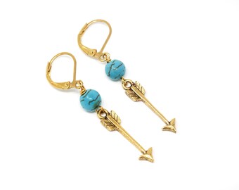 • Boho Golden Brass Arrow Earrings With Turquoise Stone Beads and Brass Leverbacks