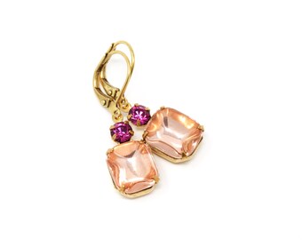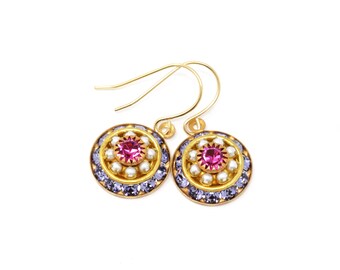 • Vintage Swarovski Round Crystal Dangle Earrings - Purple, Pearl and Magenta Pink