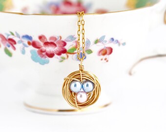 • New Mom Gift - Blue and PInk Eggs - Bird Nest Necklace - Push Present - Pearl Eggs - Gold Nest Necklace - Wire Nest Necklace