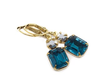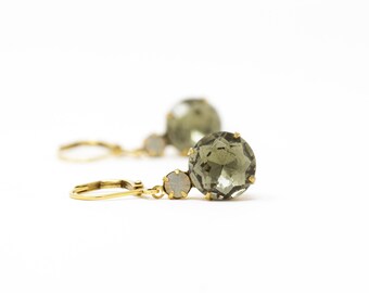 • Gray Crystal Jewel Dangle Earrings - Brass Settings - Sparkly Rhinestone Earrings