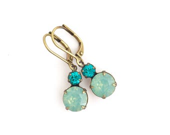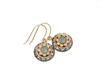 • Vintage Swarovski Round Crystal Dangle Earrings - Pale Blue, Pink and Mint Green