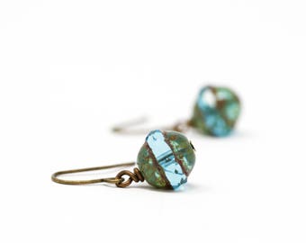 • Rustic Blue Green Rough Glass Beaded Drop Earrings With Brass Ear Wires