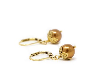 • Dainty Earrings - Copper Pearl Drop Earrings - Gold Earrings - Leverback Earwires - Gift For Mom - Wedding Earrings
