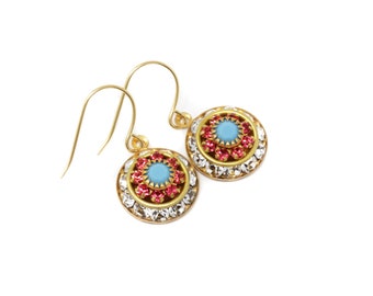 • Vintage Swarovski Round Crystal Dangle Earrings - Clear, Coral and Turquoise