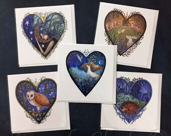 Conjunto de 5 tarjetas de felicitación del corazón por Amanda Clark - tarjetas de felicitación de temporada, tarjetas de búho, liebre, zorro, ciervo