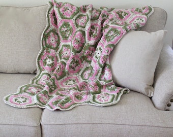 Afgano, Manta Hexagonal, Lanzamiento, Lapaghan, Mezcla de Algodón/Acrílico, Rosas y Verdes