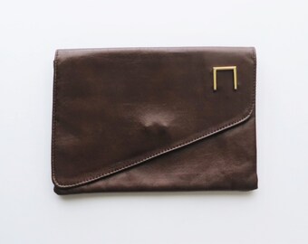 Embrague de cuero falso de los años 80, bolso de noche de vinilo marrón, monedero vegano ecológico, embrague asimétrico, embrague vintage, hecho en Canadá