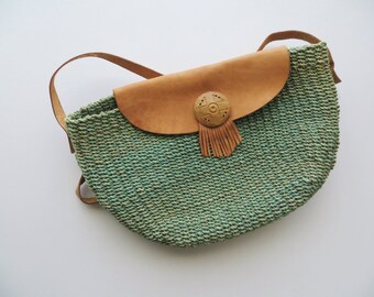 Yute vintage y bolso de cuero del mercado, verde y Tan totalizador, fin de semana bohemio bandolera