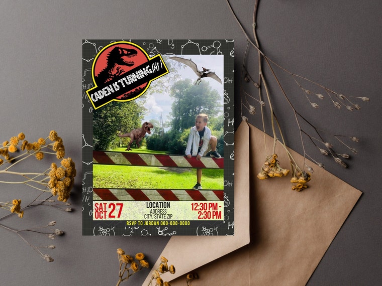 Unlimited options, designs & varieties of custom created kid birthday invitations. Jurassic Park design show. -