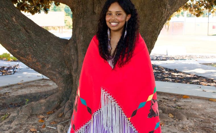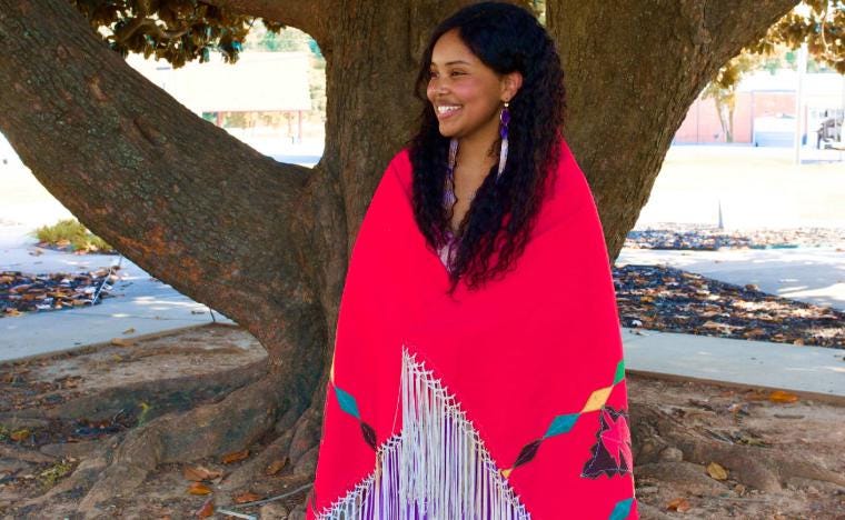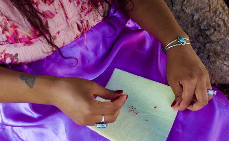 Clovie McLendon, Seneca-Cayuga and Cheyenne-Arapaho, creates beadwork and ribbon skirts that honor her Indigenous and Black heritage, celebrating resilience, culture, and community.