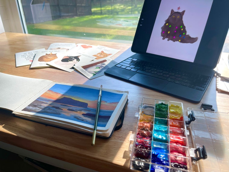 I have no fancy set-up at all. I work around my family life, and also I spend lot of time as two cats mom. I would like to design that makes you smile, put a smile on someone else’s face and give you the opportunity to send something thats unique and memorable gift.