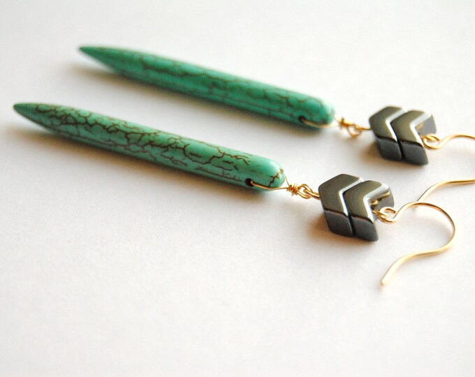 SALE - Turquoise Chevron Earrings. Long Bar Geometric Dangles. Howlite Stone Sticks. Modern Tribal Boho Chic Jewelry. FREE Shipping in US