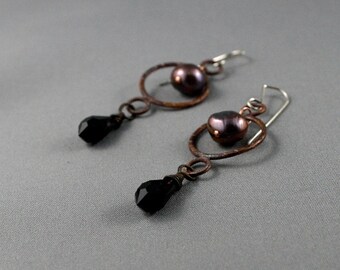 Black pearl earrings. Black Swarovski long dangle earrings. Peacock pearls. Black wedding earrings