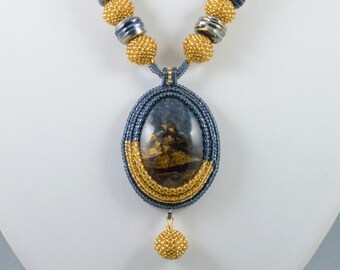 Unusual Landscape Pietersite Pendant, Art-Glass Lampwork Beads, Beaded Beads Necklace, Gold Earrings, Free Shipping