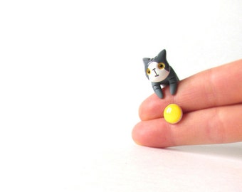 Grey white cat and yellow stud earring - polymer clay jewelry - hand painted stud earrings - fake plug