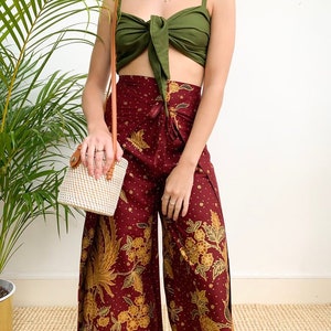 Maroon Cotton Wrap Around Trousers, Flares, Bali, Festival Trousers, Batik Handmade Trousers, Floral Bird Print