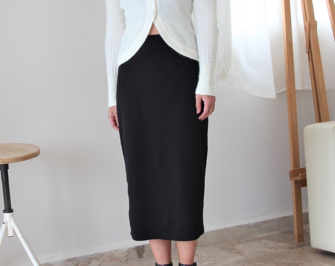 Deadstock black stretch viscose blend ribbed jersey midi skirt.