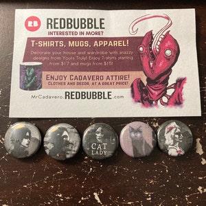 By default, I ship my buttons in a standard set of 5 with 1 design each. If you're interested in having more of the same button or a custom amount, you can contact me or do it yourself and pay directly via PayPal with the Set Maker on our Cadave.ro website.