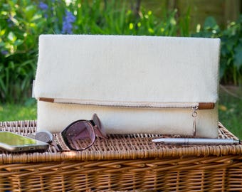 Harris Tweed Fold-over zipped large clutch bag in natural/cream twill tweed |Clutch purse, evening bag | Wedding accessory | Handmade in UK.