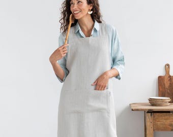 ライトグレーの日本製リネンエプロン - ポケット付きクロスバックキッチンエプロン - 料理、ガーデニング、工作に最適なミニマリストスタイル - 彼女や彼へのギフトに