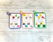 Each item is handmade with love and care. Please ensure your item is kept in it's best quality by ensuring it is stored in a dry, suitable place. When cleaning your item, please ensure it does not get wet to ensure no damanage is done. Whilst completing the writing activities, please ensure a drywipe pen is used to prevent damage.