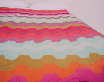 Colourful Hexagon Handsewn Quilt in Modern Retro Style, Quilted Patchwork Bedspread, Heirloom Quilt, Keepsake Quilt, Perfect Wedding Present