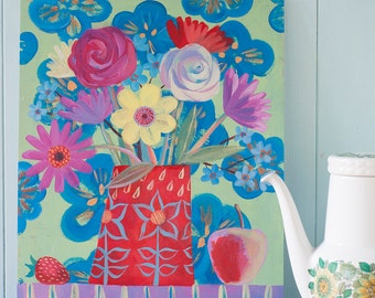 Strawberry Apple - a colourful vintage inspired original acrylic painting on wood