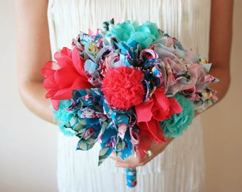 Fabric flower wedding bouquet - Turquoise & Pink - fabric flowers, brides bouquet, turquoise, pink, fabric, pompom, fabric bouquet, bespoke