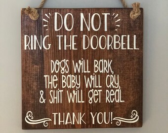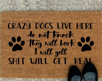 All designs are made with high quality 3 mil vinyl and is rated 6 yrs outdoors and virtually forever indoors. Dog Signs are made with outdoor vinyl lettering applied to lightweight 12x12 galvanized door sign. When ordering choose either "LIFE WILL GET REAL" or "SHIT WILL GET REAL" from the drop down.