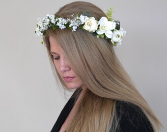 The Boho Bride - cream flower crown with baby's breath and ranunculus, bridal, bride, wedding, bridal headpiece, headband