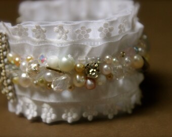 French glam white romantic wedding hand stitched beaded statement cuff bracelet FREE SHIPPING