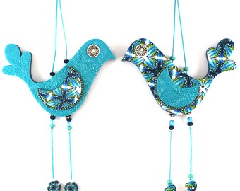 Couple of Unique pattern turquoise blue flat loving romantic birds for wall hanging decoration, handmade millefiori polymer clay