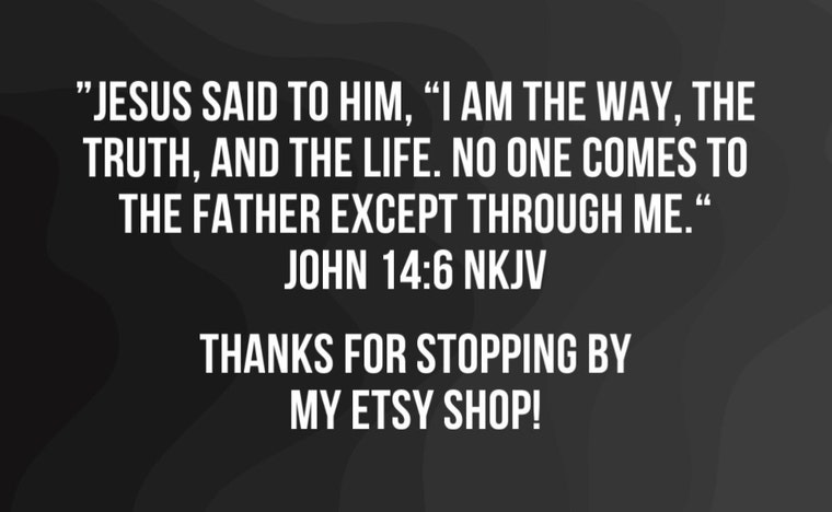Last, but certainly not least, is my mission. As you can see in my shop's banner, I strive to create "heavenly designs for earthly spaces". My creativity is ultimately inspired by THE Creator who gave me life and purpose. Not only did God create me, but He also made a way for me to have a personal and right relationship with Him despite all my sins and failures by send His Son Jesus Christ to pay the price for my sins and reconcile me to Himself forever. It is purely by God's grace and mercy that I have breath in my lungs and a peace that surpasses all understanding. It is my life's goal to lead others into to a personal relationship with the Lord Jesus Christ. May God bless you and thanks again for checking out my shop!