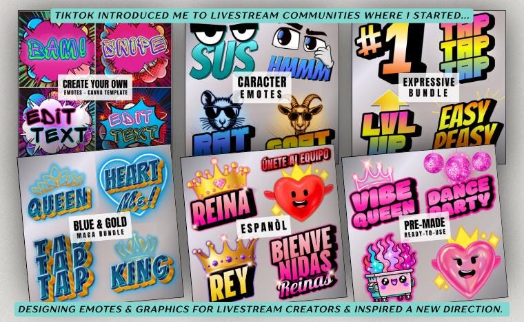 🎨 Today, I design what I like to call “LIVESTREAM CHAT BLING” - emotes, graphics, and creator tools that help livestreamers bring personality, fun, and visual energy and chat engagement to their communities.