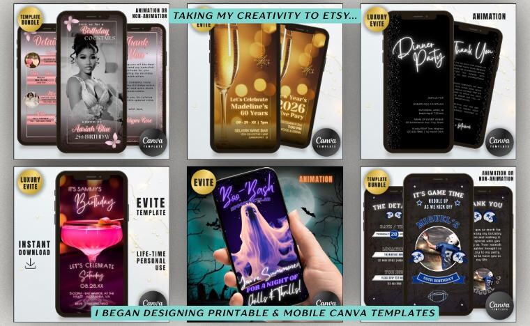 🎁 At first, I focused on digital event templates: invitations, party planners, itineraries, and celebration designs that anyone could customize in Canva. My goal was to create designs that are beautiful but also incredibly simple to use. Design connoisseurs can edit their own details, photos, download, and send their invitation via text, email, or social media within minutes.