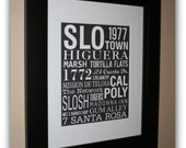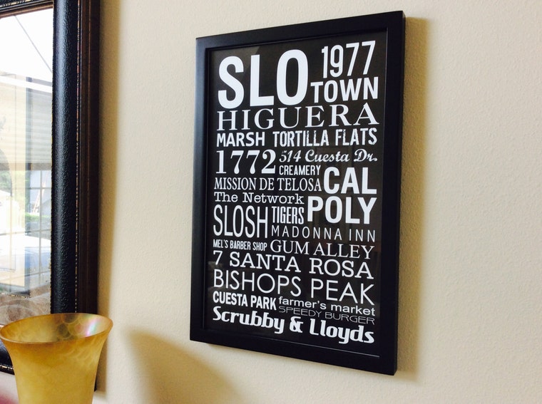About this same time my very good friend and co-worker had opened a shop on Etsy and encouraged me to find something that I could create, be passionate about, and sell on Etsy. It would be an addition to my full-time career as a graphic artist in the screen printing industry. The hunt was on to find the perfect thing! I was inspired by the popular Subway Style of typography to create a memory board, of sorts, for my own home. The memories of my hometown, San Luis Obispo, arranged in an interesting collaboration of fonts, sizes and strengths, white on black. I loved it and so did my family and friends. I realized there were other people that would really love this concept. Hometown memories, vacation memories, retirement, birthday and anniversary gifts...there are so many applications! That was the jumping off point for me. I opened my shop in 2011 and have, to date, created over 700 completely different, 100% custom, pieces of art for some of the best folks on the planet and it continues to be my best selling design. My shop has continued to grow into a collection of my favorite Scriptures, Quotes and paintings arranged creatively with modern typefaces.