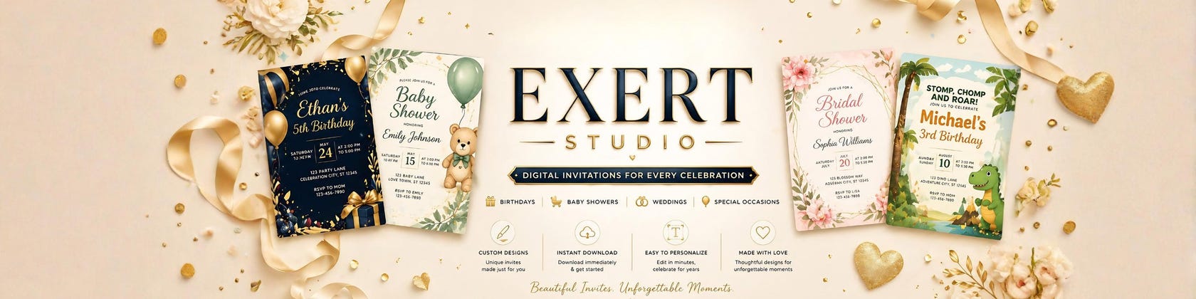 Exert Studio creates modern, elegant digital invitations for birthdays, baby showers & weddings. Instant download designs made to make your celebrations beautiful, stylish and stress-free.