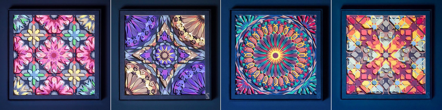 I enjoy taking a forgotten subject and adding my perspective to bring out different facets of it. Exploring a topic from different angles is the reason most of my work are in series. I usually spend a year on a project and strive to make it more intricate and more colorful than the last. For the last two years I have been involved in my longest projects yet, namely ‘Spectral Matrix’ and ‘Transcendence’.