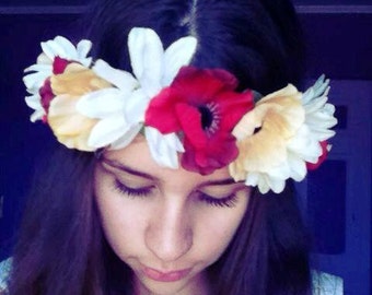 On SALE Flower Crown, Daisies and Poppies Crown, Red Yellow Poppies White Daisies Flower Crown, Music Festival Floral Halo, Floral Wreath