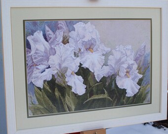 Cross Stitch embroidered flowers ' Mauve, lilac Irises'. Embroidered pattern. Home decor. Gift for all. Irises picture. FREE SHIPPING