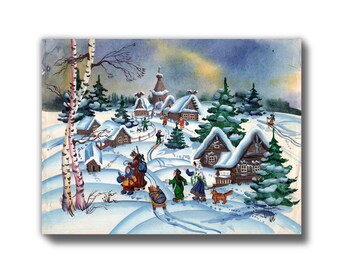 Print of my Watercolor, folklore, Russian popular print, winter, rustic landscape, village church, rural landscape, Slavic folklore