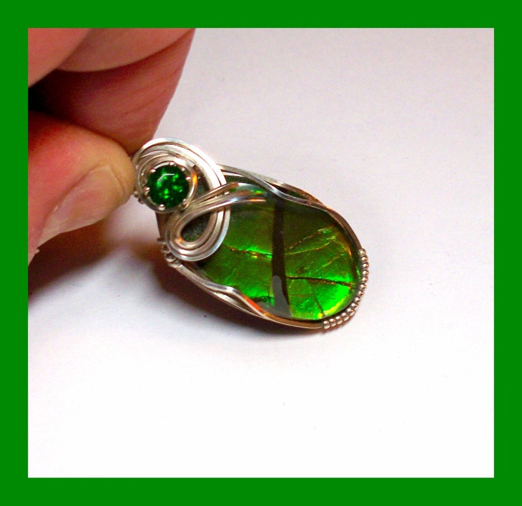 Ammolite and Chrome Diopside Wire-wrap Pendant -