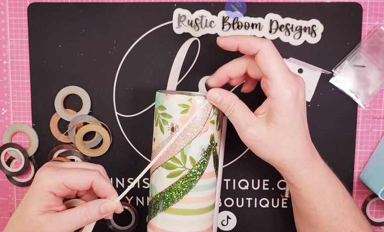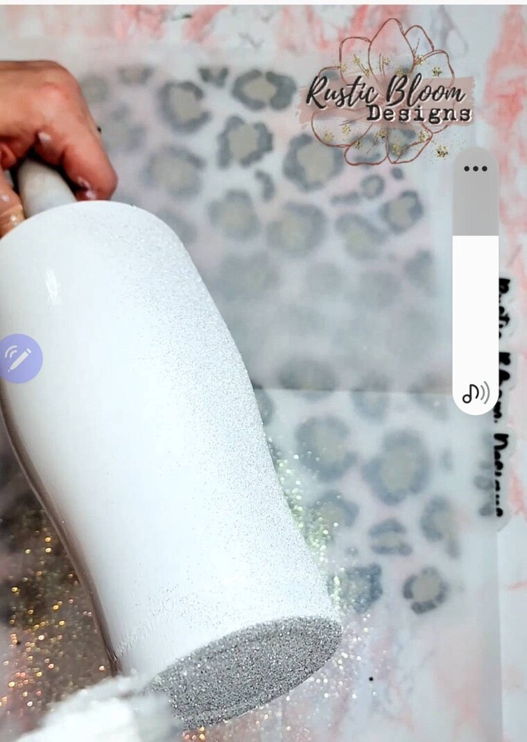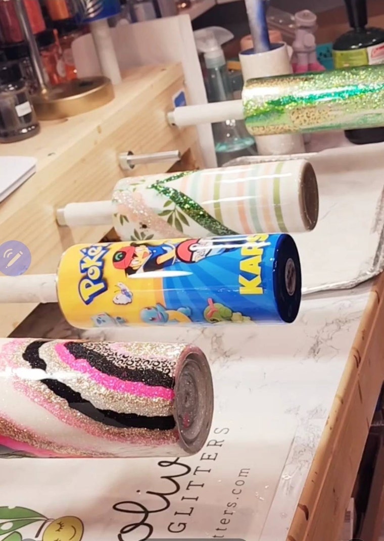 Applying the last few layers of epoxy on the tumbler after all the glitter and vinyl has been sealed. -