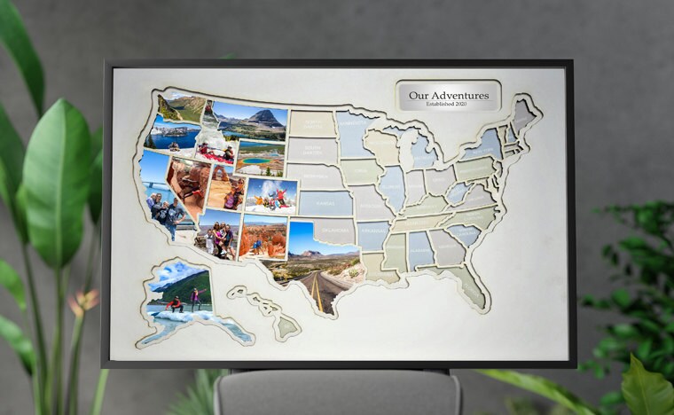 USA Photo Map with Wooden Frame - Create a Travel Collage - Perfect Gift for Travelers - 50 States Map -