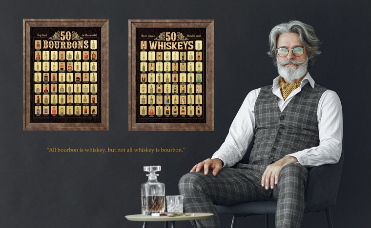 Set The Bourbon and Whiskey posters, Man Caves Gifts, Christmas Gift, Poster of the World's Top 50 Bourbons and Whiskeys -