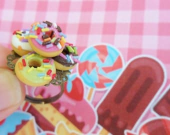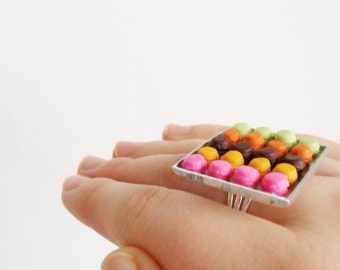 The McGriddle is made from hard plastic. It used to be a keychain. I thought it would make an awesome ring, so I cut off the keychain and glued a ring base to the bottom of the McGriddle. The antiqued brass ring base is nickel free and adjustable.
