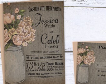 Rustic Wedding Invitation, Mason Jar Wedding Invitation, Barn Wedding, Country Wedding Invitation, Peach Peony, Burlap, DIY Printable Invite