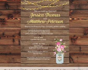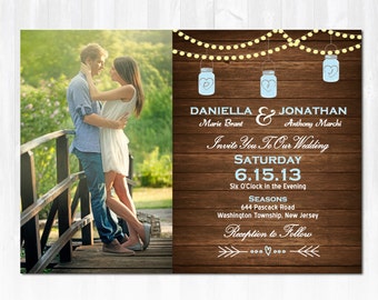 Mason Jar Wedding Invitation DIY PRINTABLE Digital File or Print (extra) Country Wood Wedding Invitation String Light Wedding Invitation