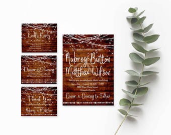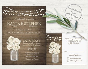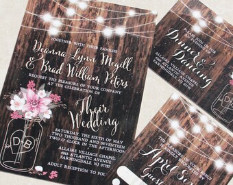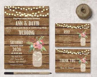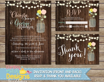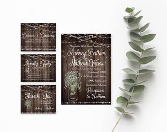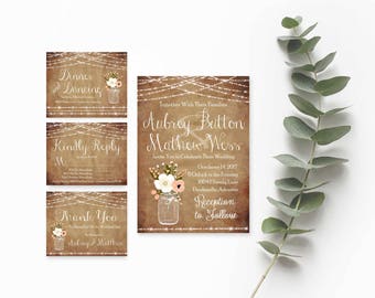 Rustic Mason Jar Wedding Invitation, RSVP, Thank You Card, Wood, Mason Jar, String Lights, Shabby, Wedding Invitation Suite, Digital & Print